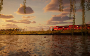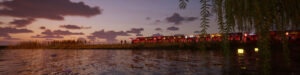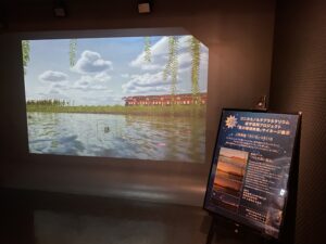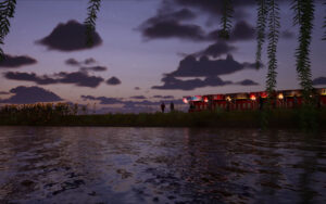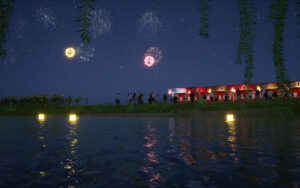シミュレーションによる雲や川面を流れてくる花や灯篭は