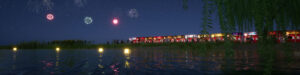 一日の時間経過と川面と縁日の屋台、そこに行きかう