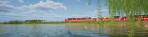大きな川としだれ柳、土手には屋台が並んでいます。