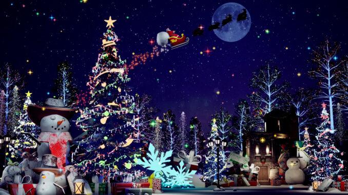 空にはサンタクロースがプレゼントの大きな袋を背負い