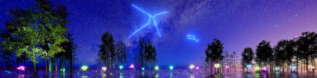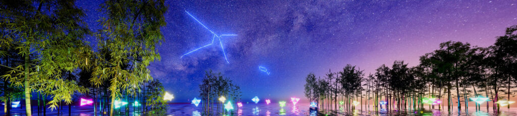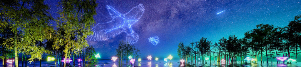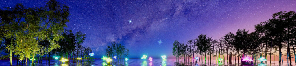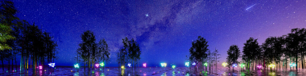 夜空の見え方と竹林やオブジェのレイアウトに