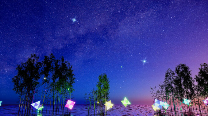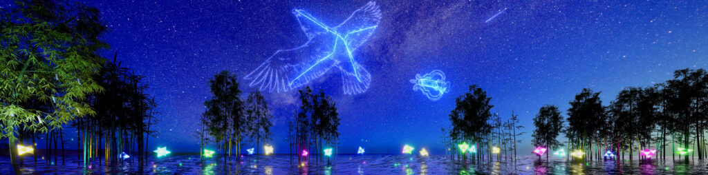 水面には星屑のオブジェや光の精が舞い上がります。